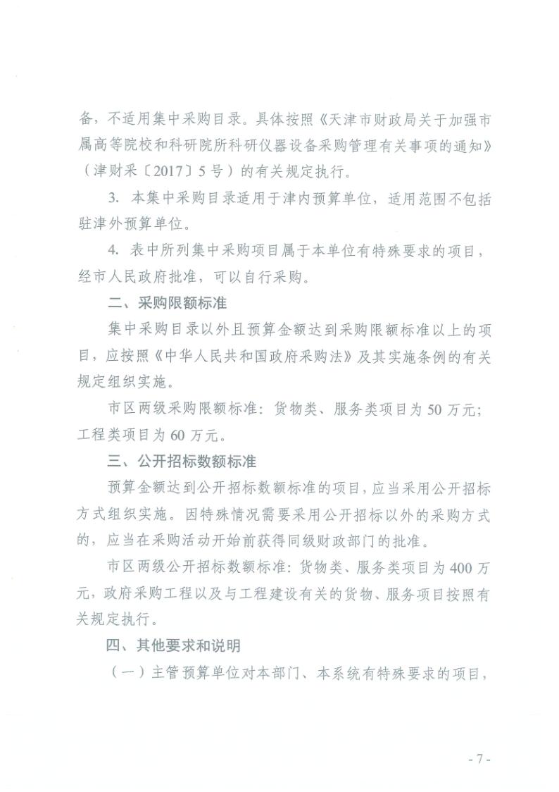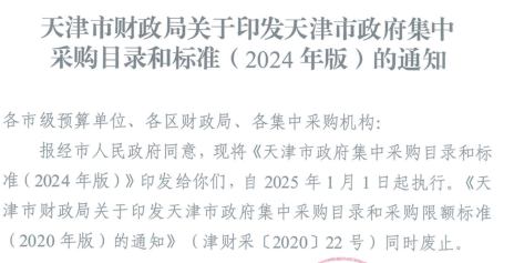 现将《天津市财政局关于印发天津市政府集中采购目录和标准(2024年版)的通知》(津财采〔2024〕17号)转发给你们,自2025年1月1日起执行。《天津市财政局关于印发天津市政府集中采购目录和采购限额标准(2020年版)的通知》(津财采〔2020〕22号)同时废止。