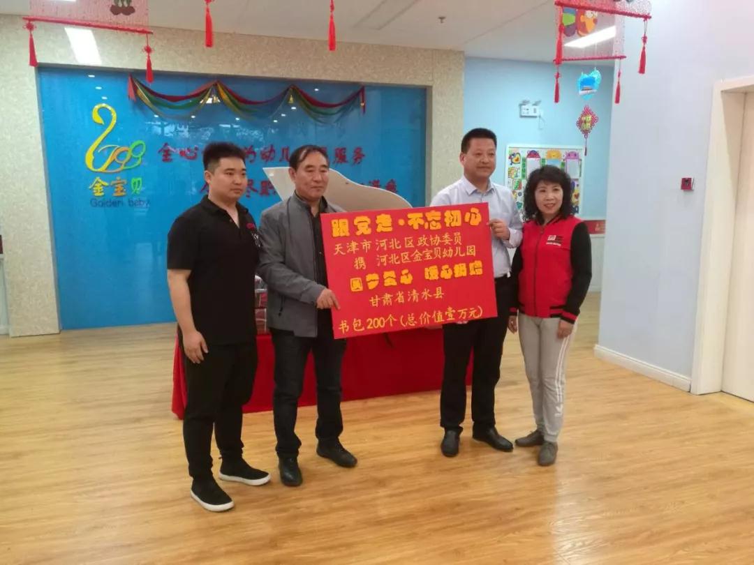 考察团实地参观了园区设施、观看了幼儿才艺表演、听取了园所情况介绍,全面了解了幼儿园的建设和教育教学等情况。期间,区政协委员吕林携金宝贝幼儿园全体教职人员向清水县捐赠学生书包200个(总价值1万元),表达了政协委员永远跟党走的决心和真情扶贫、回馈社会的诚心。清水县政协主席丁旺喜作为代表接受了捐赠。区政协主席燕连玉希望两地政协以此为契机,进一步促进两地幼教事业的发展,在扶“志”和扶“智”上下功夫,进而全面深入推动对口帮扶各项工作,高标准高质量完成脱贫攻坚任务。